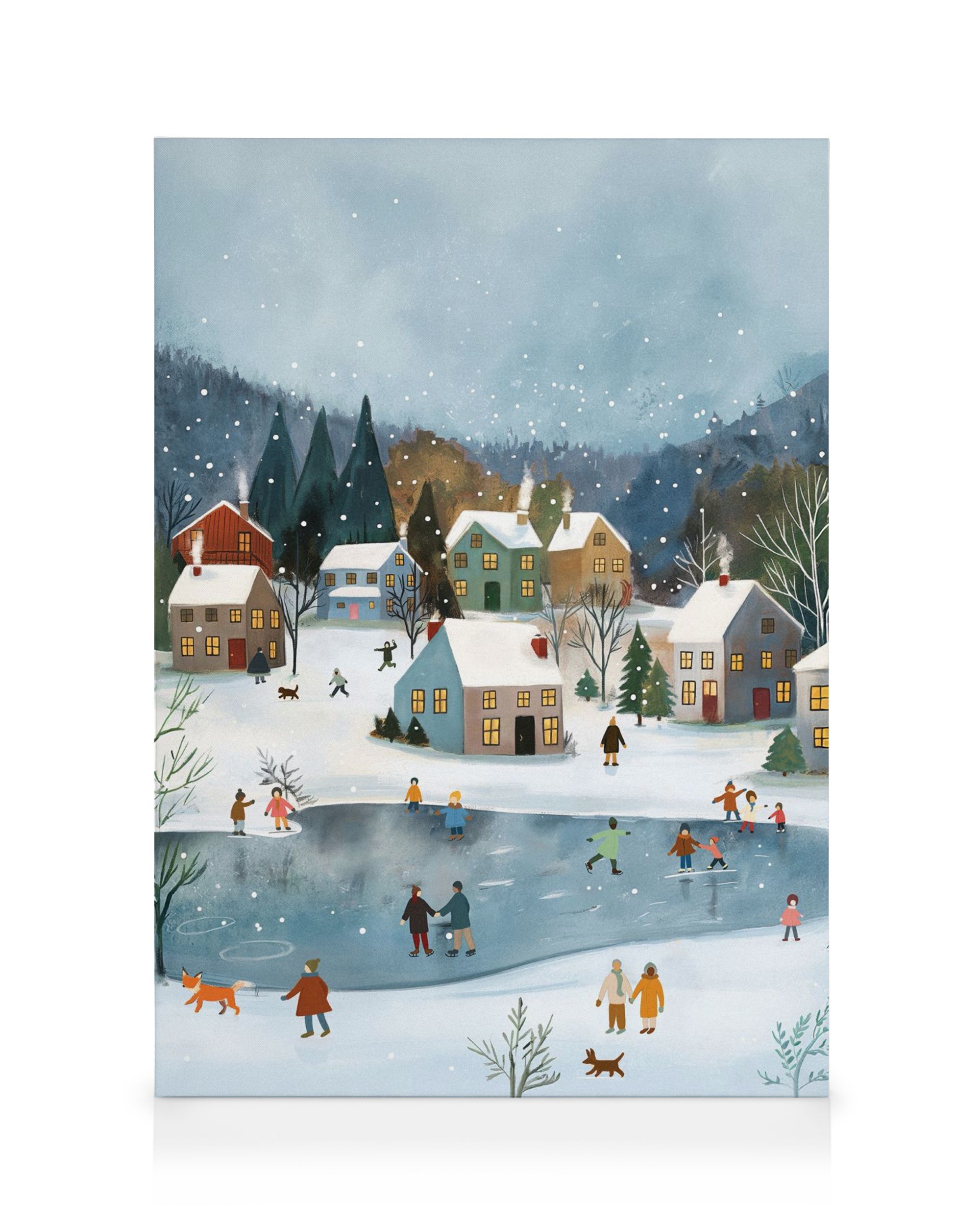 Villaggio invernale: due quadri mostrano scene di neve con case, alberi e persone. Un'atmosfera magica con colori dolci blu, bianchi e marroni per la tua galleria a parete.