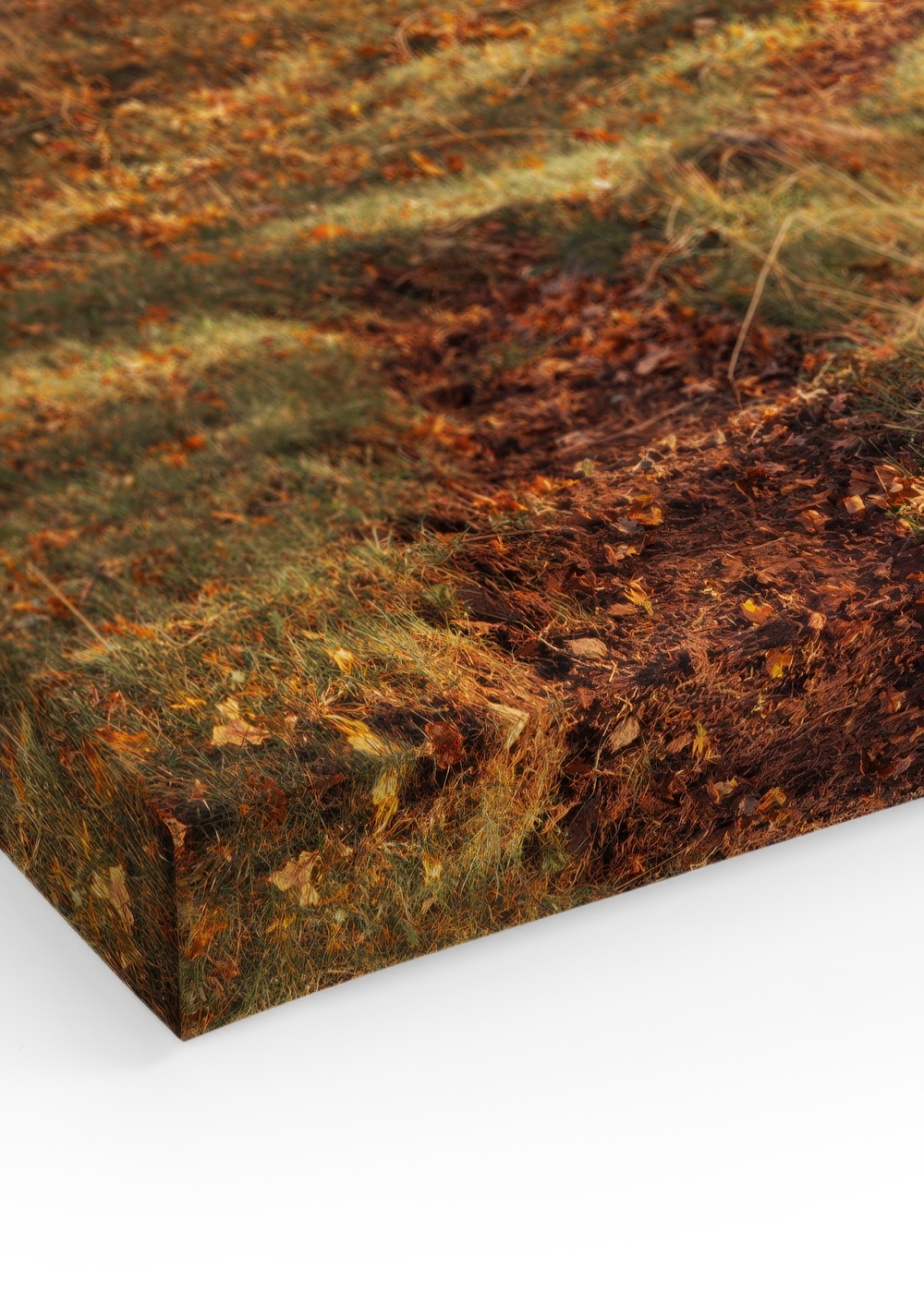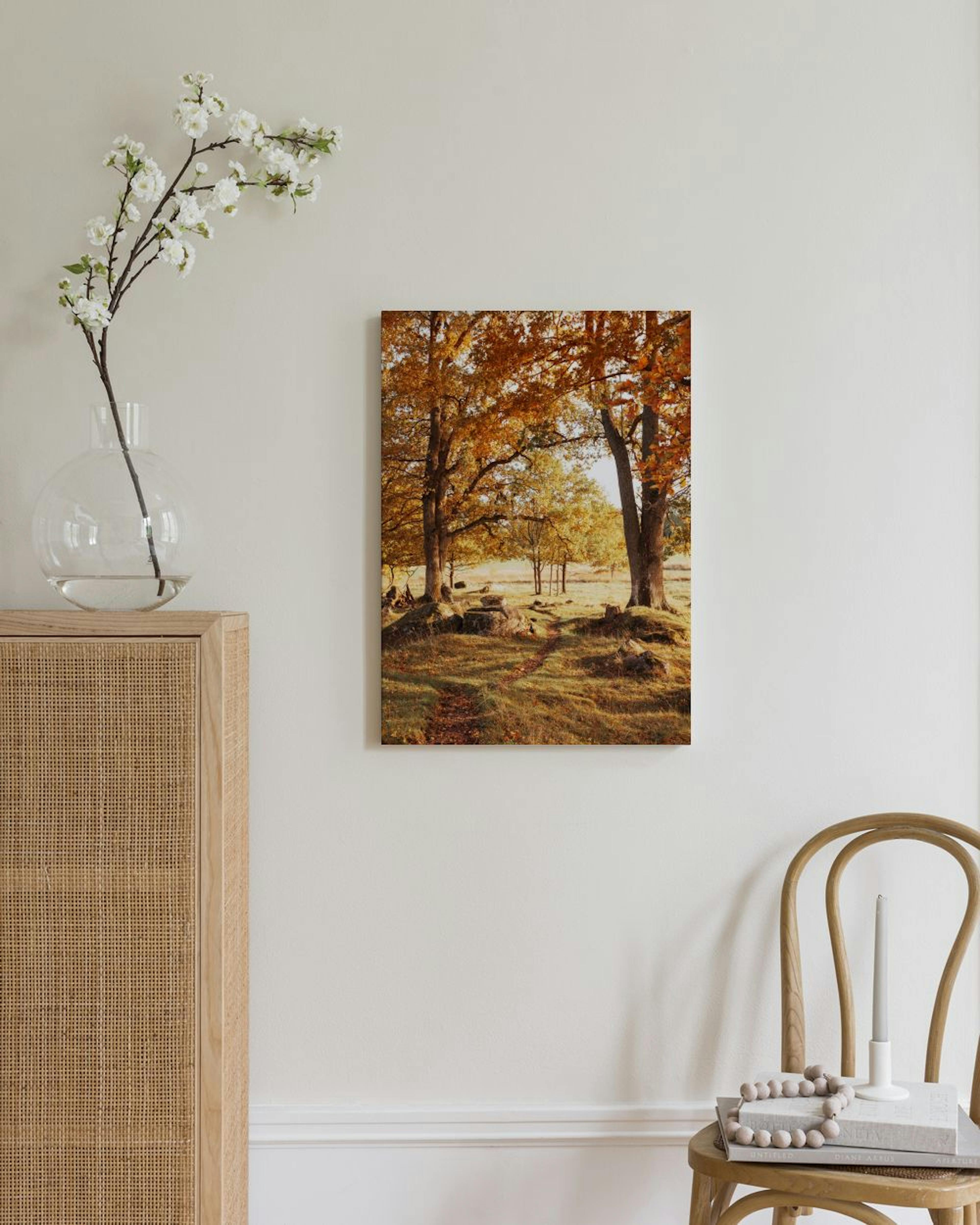 Da 7,77 €Una splendida stampa su tela di una foresta autunnale, con un sentiero fiancheggiato da foglie arancioni e gialle e la luce del sole che filtra tra gli alberi.