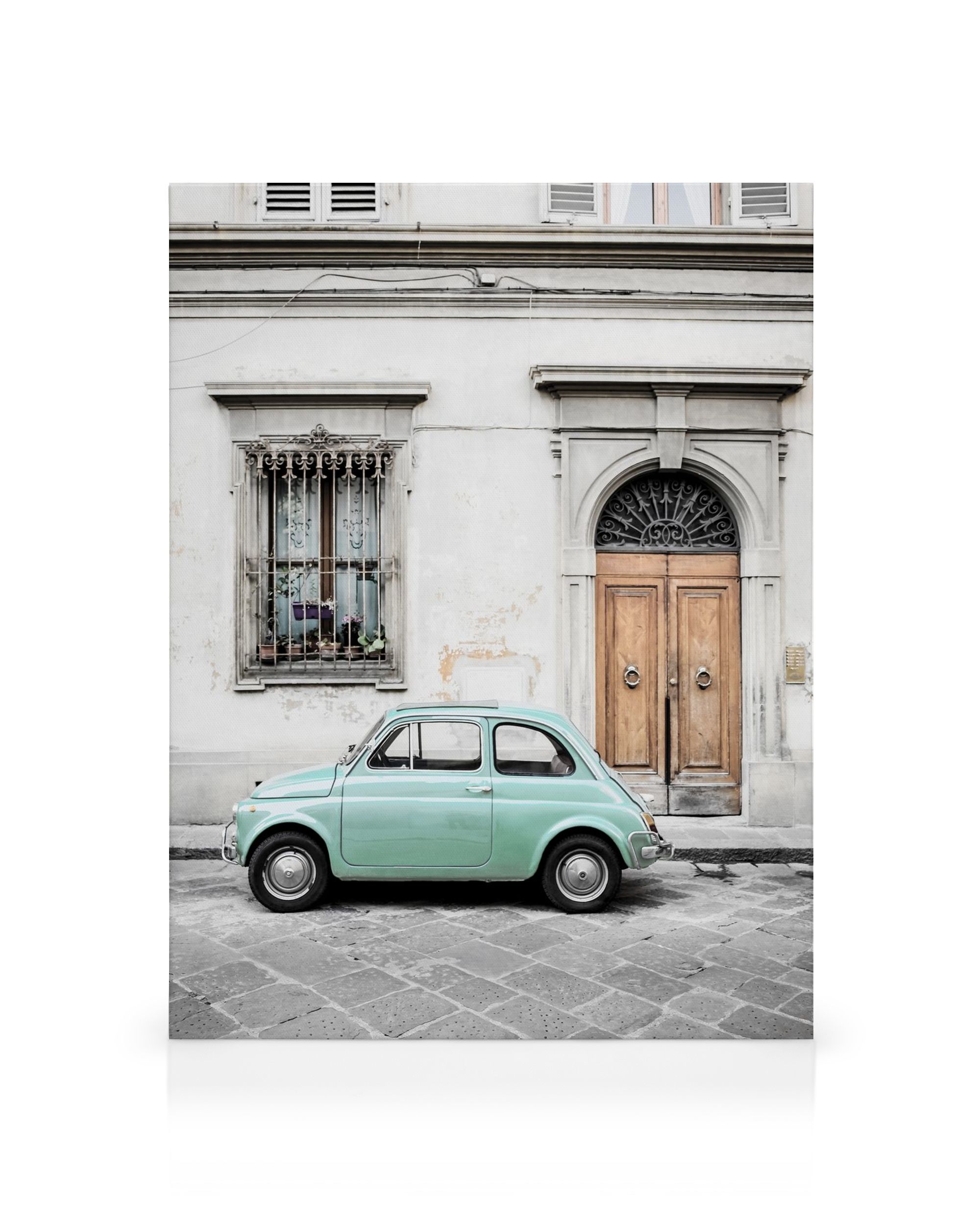 Auto d'epoca verde in Italia: questa stampa cattura il fascino di una piccola macchina vintage parcheggiata su una strada di pietra con colori grigio e turchese.