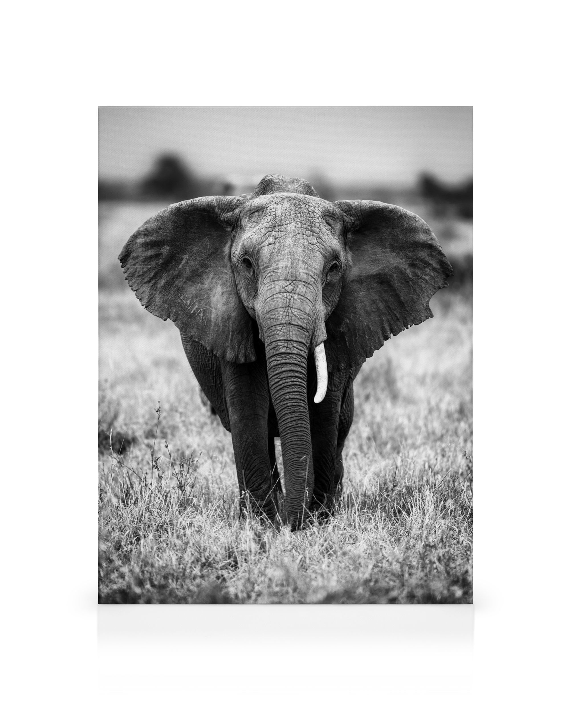 Questa stampa in bianco e nero mostra un elefante nella savana africana tra l'erba alta. Cattura la maestosità della natura selvaggia.