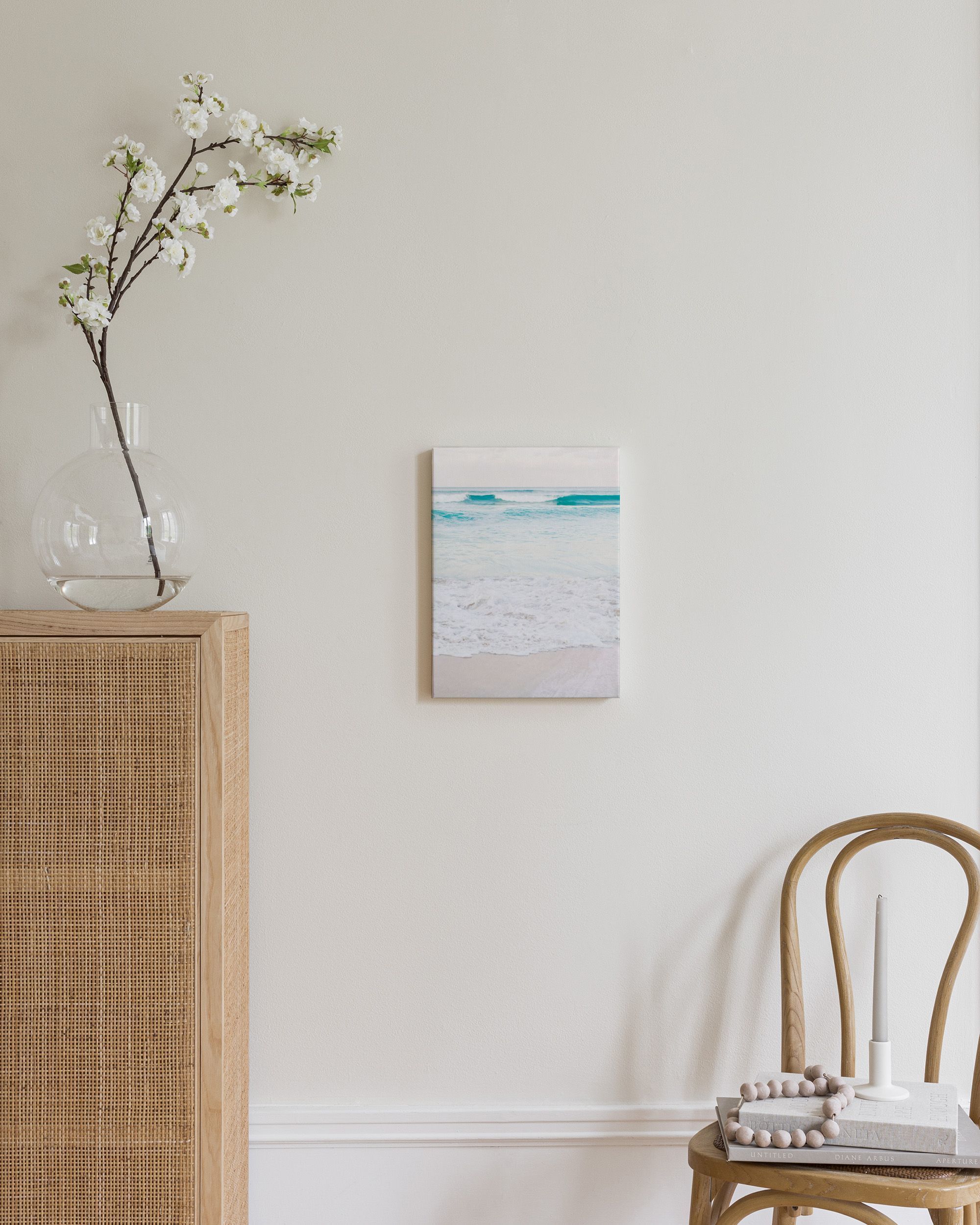 Onde blu e schiuma bianca si incontrano sulla sabbia dorata. Questo poster cattura la bellezza di una spiaggia da sogno con colori turchesi delicati e un cielo sereno.