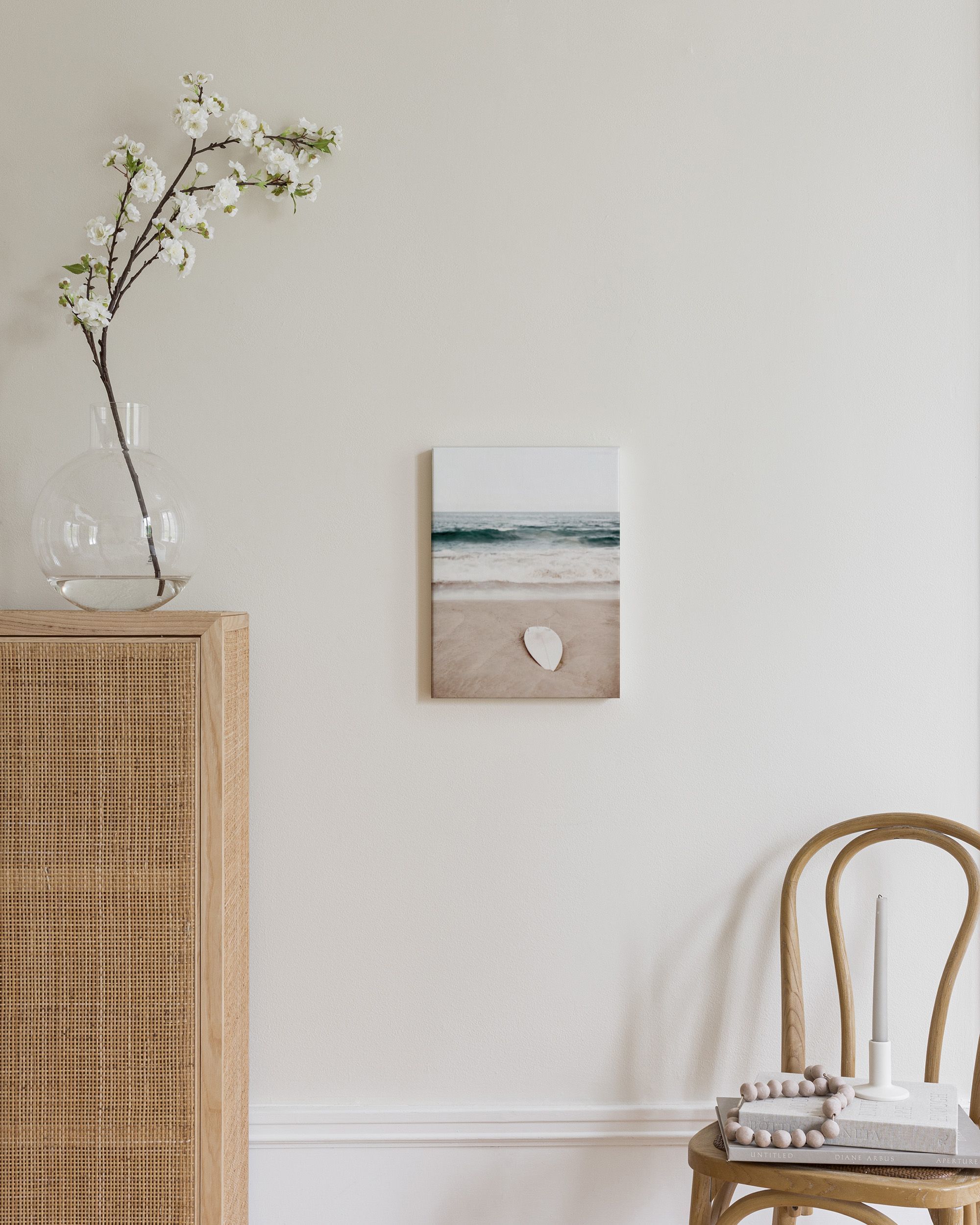 Tavola da surf bianca sulla spiaggia di sabbia dorata. Le onde turchesi si infrangono dolcemente sulla riva, creando una scena calma e serena perfetta per gli amanti del surf.