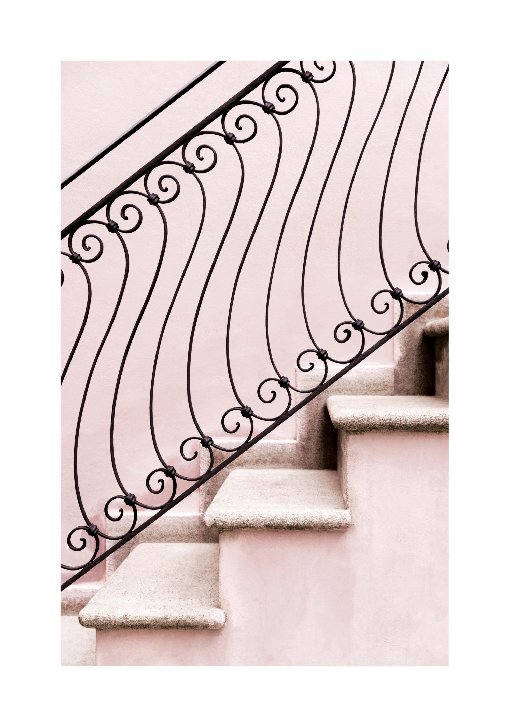 Un grazioso poster fotografico con il motivo di una scala rosa e una ringhiera nera. La ringhiera è curva e conferisce alla stampa un aspetto giocoso. Questa fotografia si sposa perfettamente con uno stile di interior design romantico.