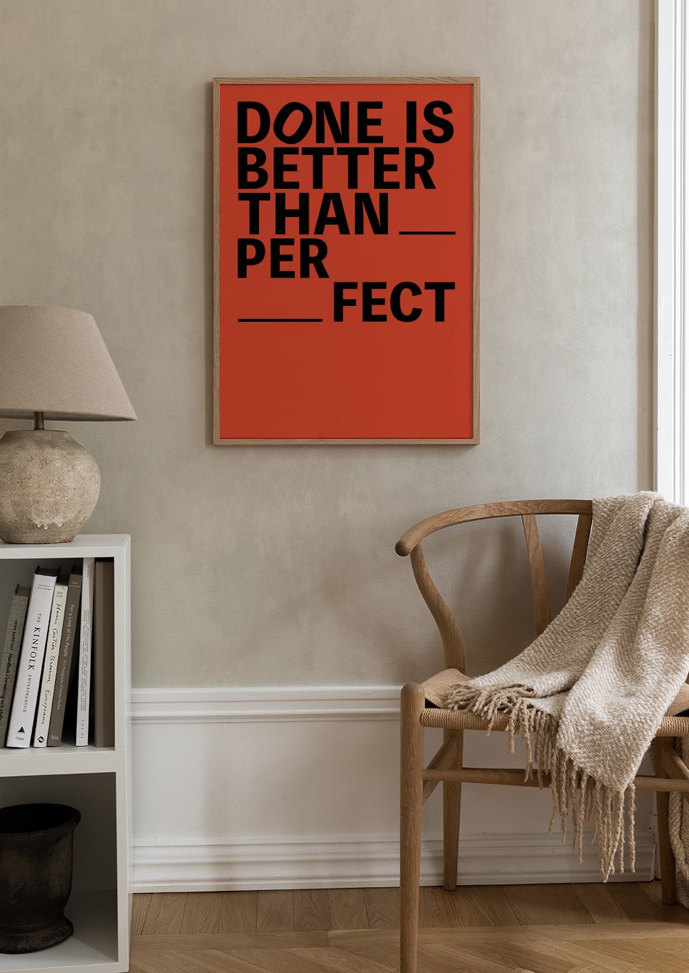 Un poster audace con il testo motivazionale "Done Is Better Than Perfect" in nero su sfondo rosso. Perfetto poster da parete per ispirare la produttività!