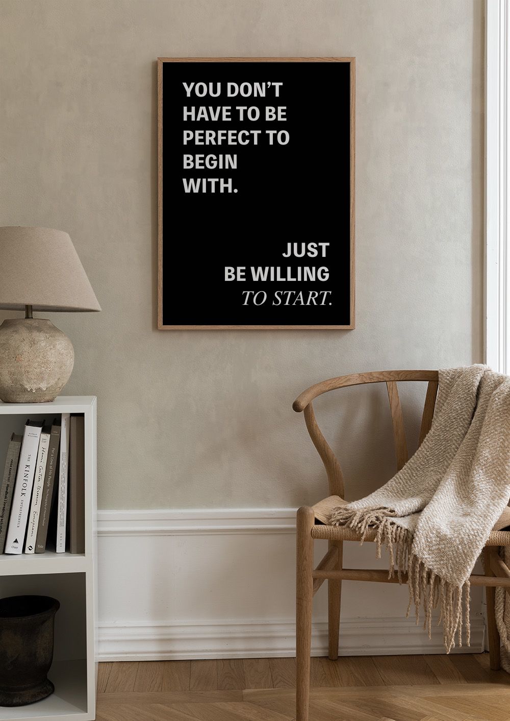 Poster motivazionale con testo bianco su sfondo nero. Un poster semplice e stimolante per ricordarti di fare il primo passo.