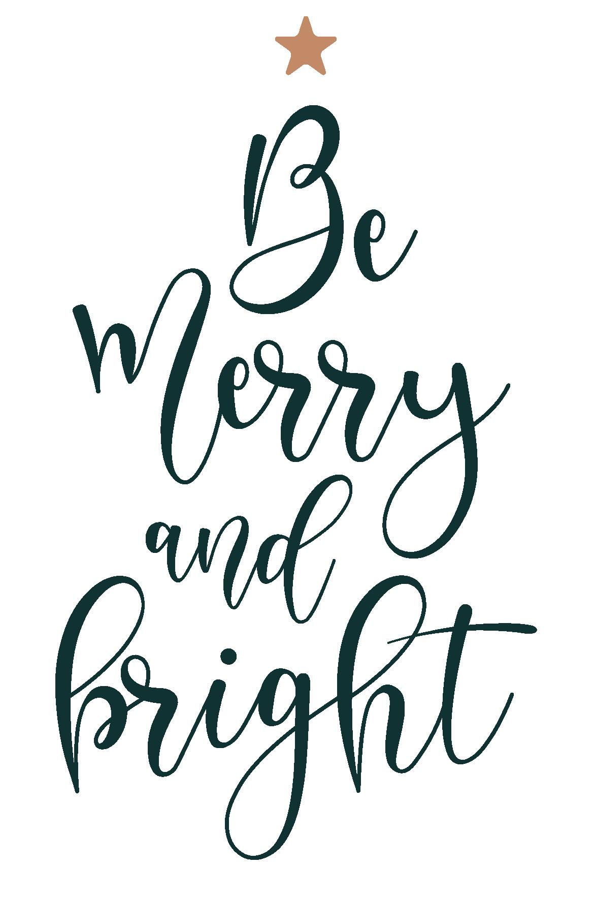 Stampa di citazione di Natale con il testo "Be Merry And Bright" in nero su sfondo bianco e una piccola stella in alto. Magica stampa di testo che puoi aggiungere sul comò, in corridoio o in soggiorno. Crea un'atmosfera invernale e natalizia!