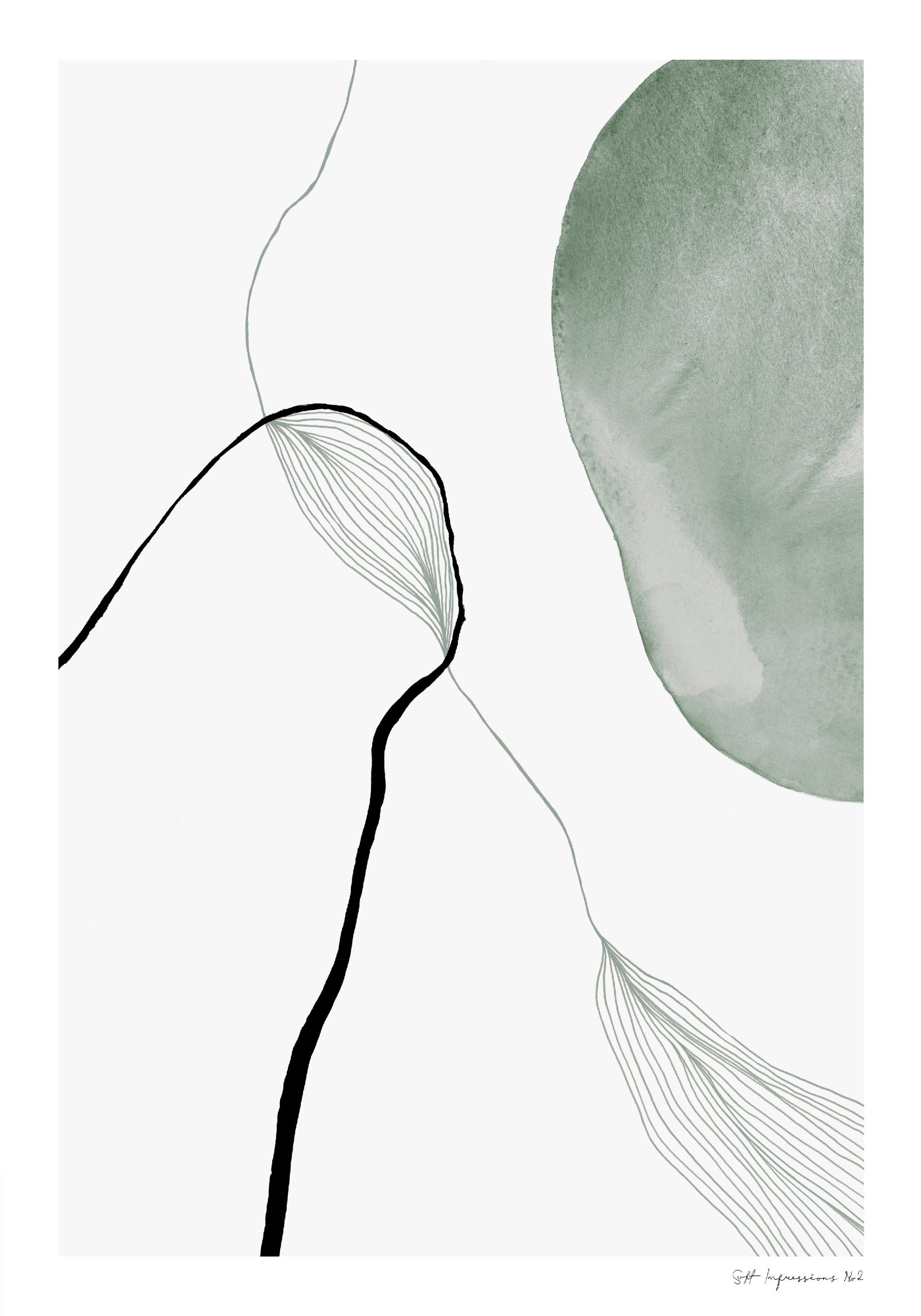 Un poster artistico minimalista con delle forme astratte nere e verdi su sfondo bianco. Metti in risalto accenti minimalisti ed eleganti con questo poster di illustrazione astratta e combinalo con "Soft Impressions Nr1 Poster" per uno splendido abbinamento di poster. La combinazione di colori chiari e tenui rende questo poster perfetto per tutti i tipi di stili di interni.