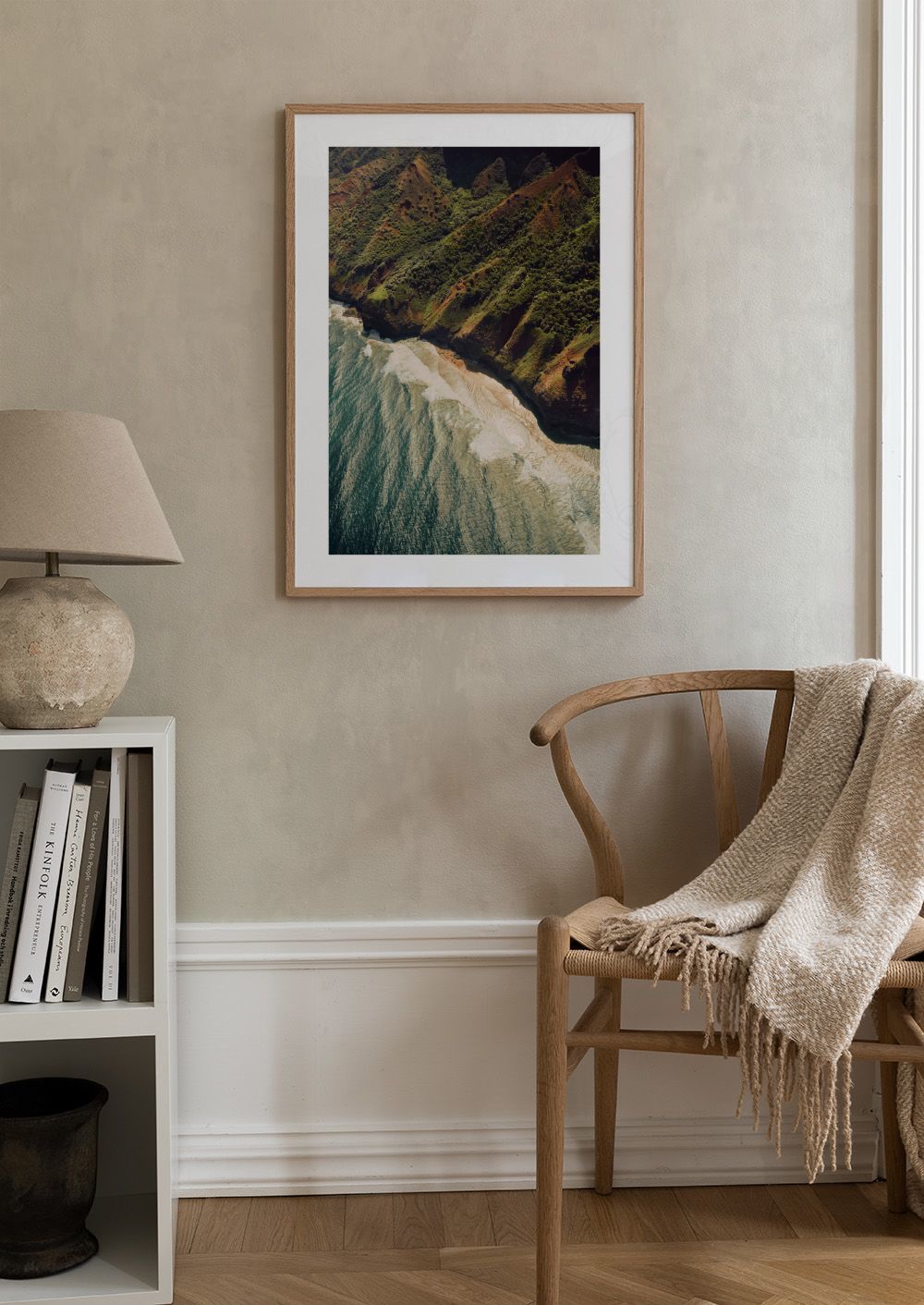 Cattura la bellezza mozzafiato delle Hawaii con questo poster aereo della Costa Na Pali. Scogliere verdi e oceano blu creano un paradiso naturale.