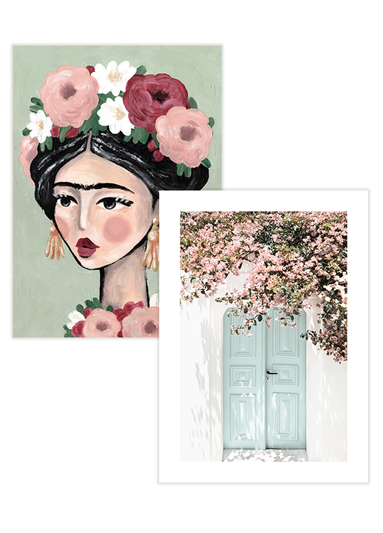 Da 9,07 €Un duo di poster che comprende un poster con Frida Kahlo impreziosito da un delicato copricapo floreale, e una foto di un portone adornato da fiori. Questo set di poster dà vita a una splendida galleria a parete, aggiungendo un tocco di calore ed eleganza ad ogni ambiente.