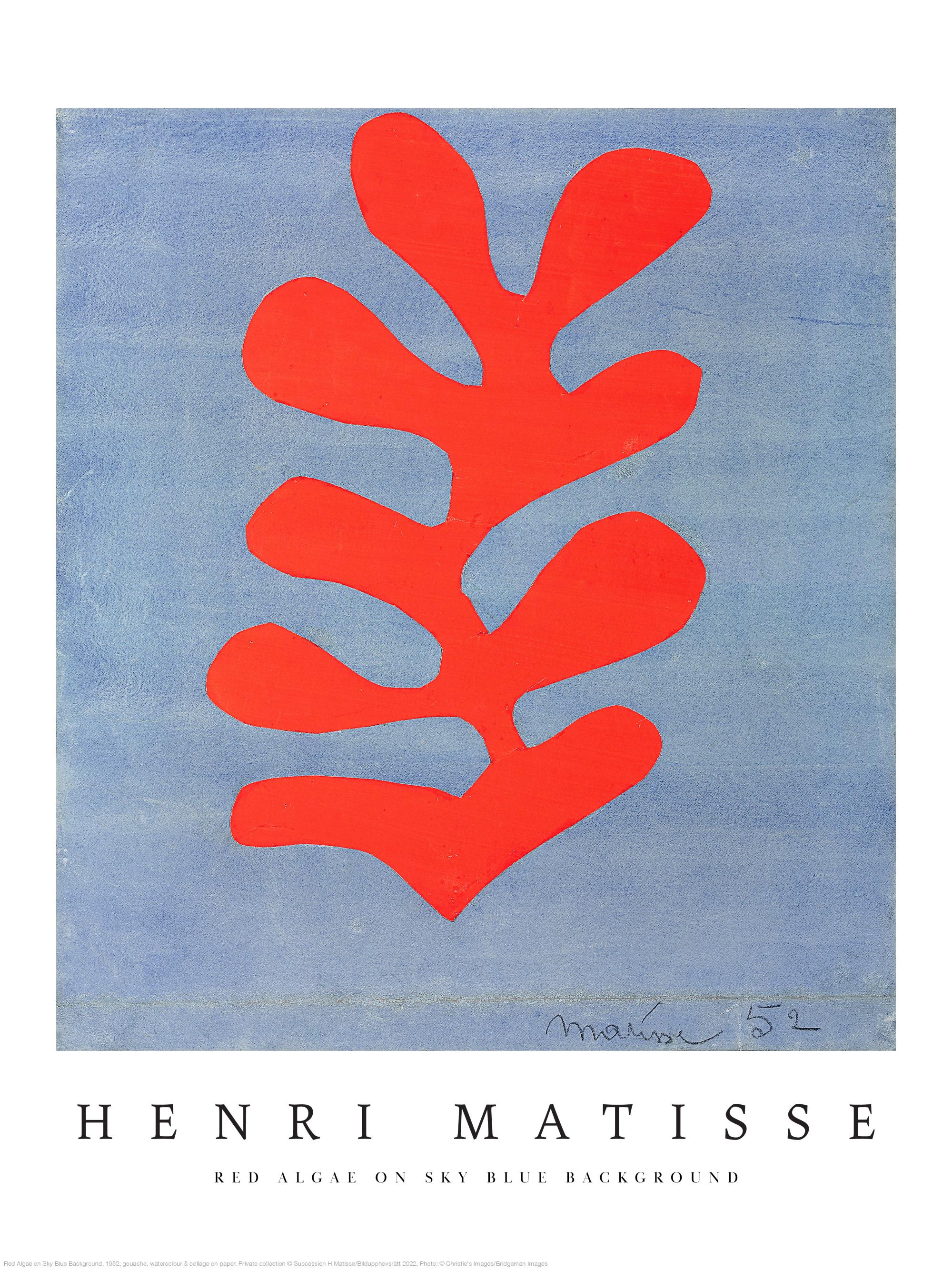 Da 16,84 €Alghe rosse su sfondo blu cielo: un'opera audace di Henri Matisse. La forma rossa ricorda una pianta stilizzata su uno sfondo blu morbido e texturizzato.
