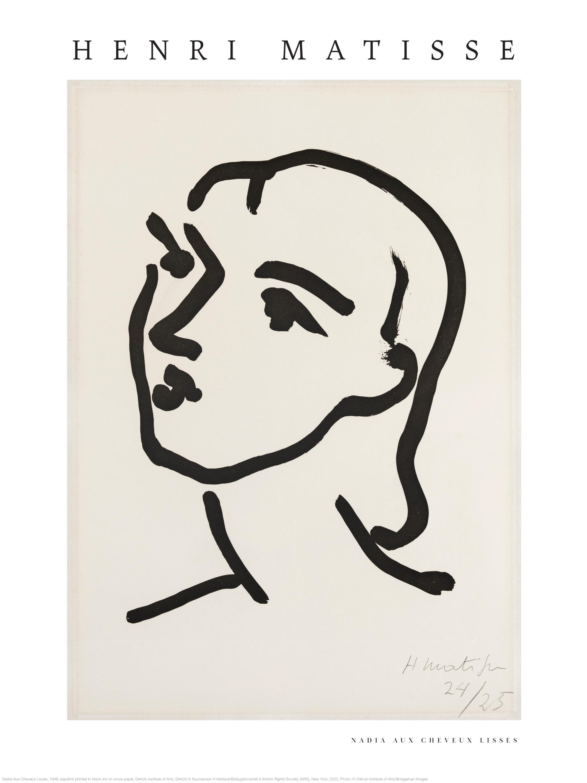 Un ritratto minimalista di Henri Matisse. Questo quadro mostra un volto di profilo disegnato con linee nere semplici su sfondo bianco.