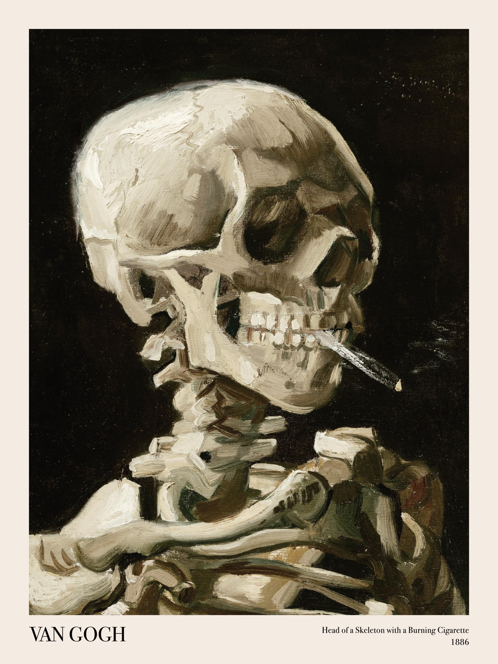 Da 16,84 €Un teschio umano con una sigaretta accesa in bocca. Il fumo sale lentamente. Lo sfondo è scuro e i colori sono beige e marrone. Questo poster mostra un'opera famosa di Van Gogh, dipinta con pennellate spesse e decise.